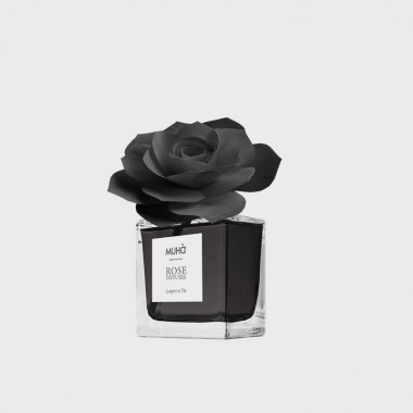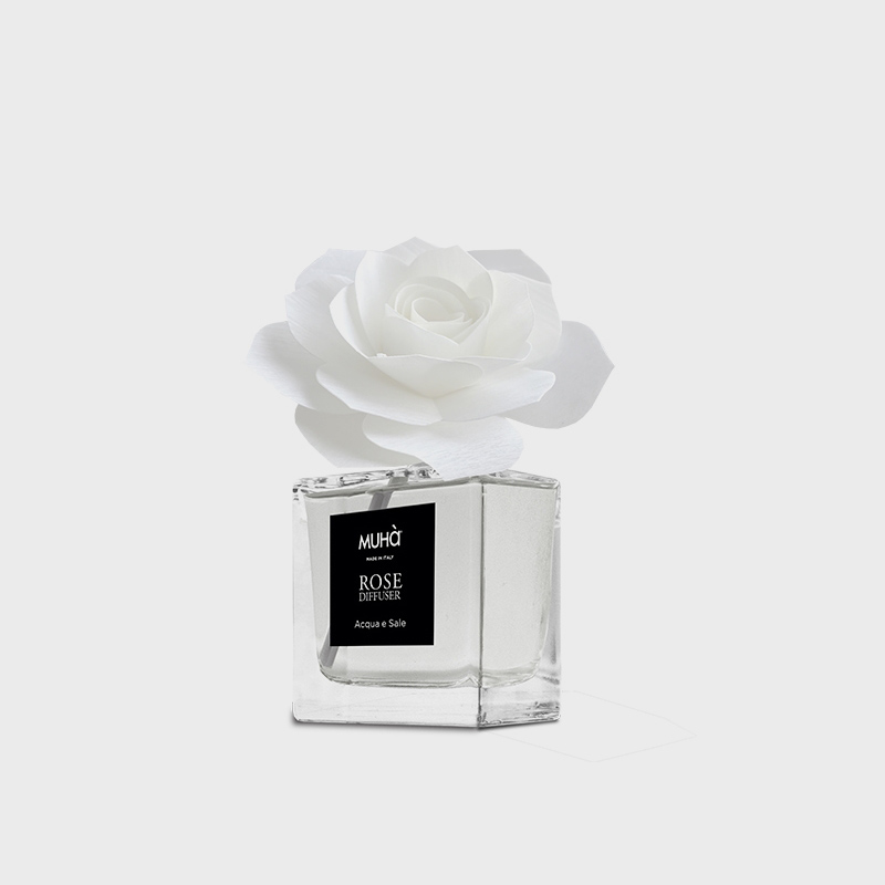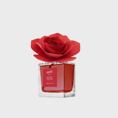 Profumatore d'ambiente in bottiglia di vetro con diffusore a formadi rosa in legno di betulla realizzato a mano.