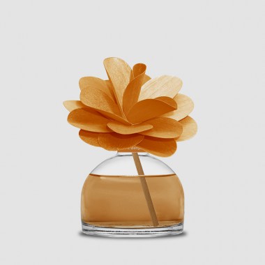 Profumatore d'ambiente in bottiglia di vetro con diffusore a forma di fiore in legno di betulla realizzato a mano. CEDRO E BERGAMOTTO