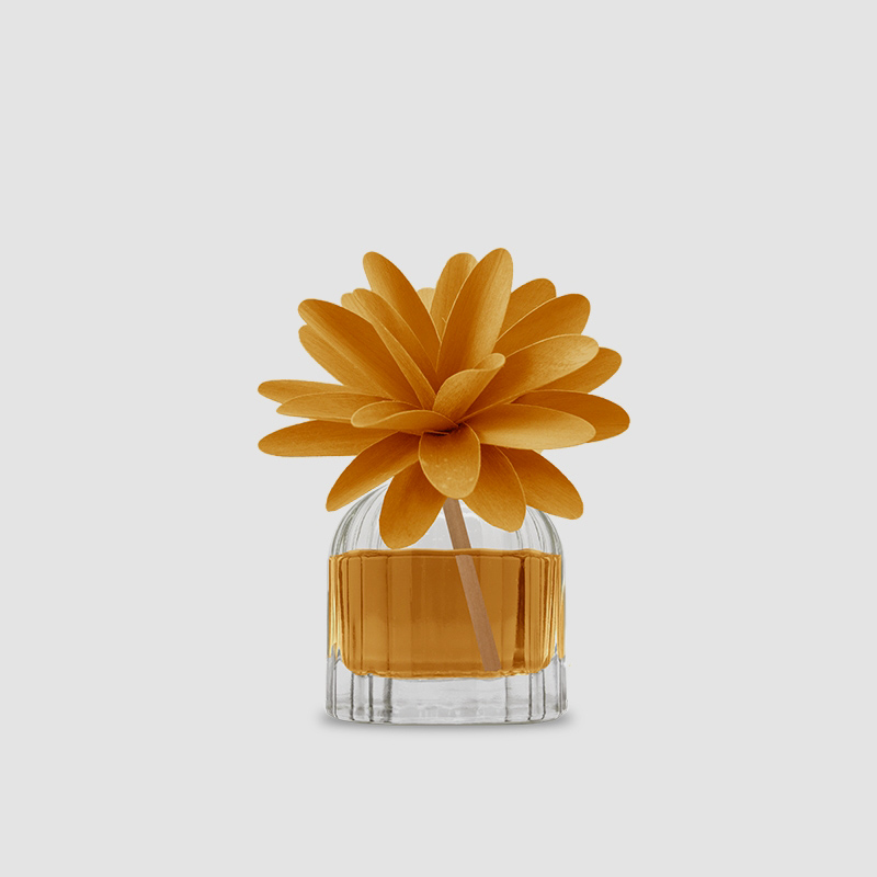 Profumatore d'ambiente in bottiglia di vetro con diffusore a forma di fiore in legno di betulla realizzato a mano. CEDRO E BERGAMOTTO