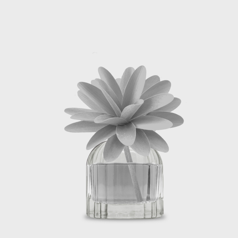 Profumatore d'ambiente in bottiglia di vetro con diffusore a forma di fiore in legno di betulla realizzato a mano.