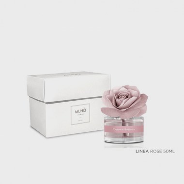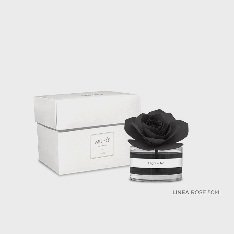 Una raffinata confezione in bottiglia di vetro, con diffusore a forma di rosa in legno di betullanaturale realizzato a mano.